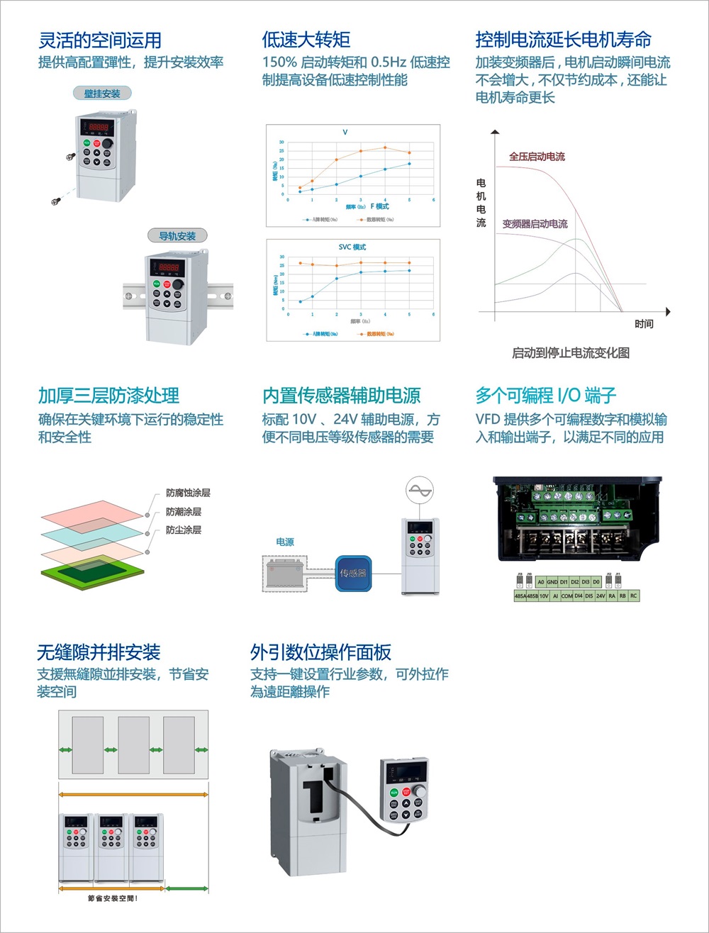 SN160MN系列是一款小型紧凑型的通用型变频器,支持开环矢量控制,PID,多段速,简易PLC等常用功能。
